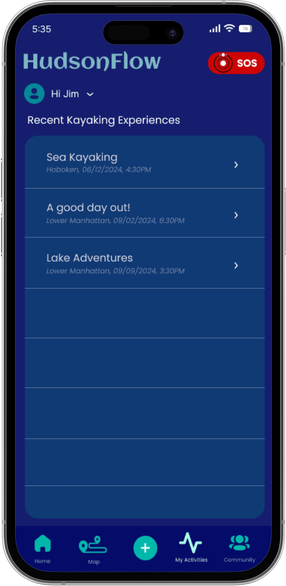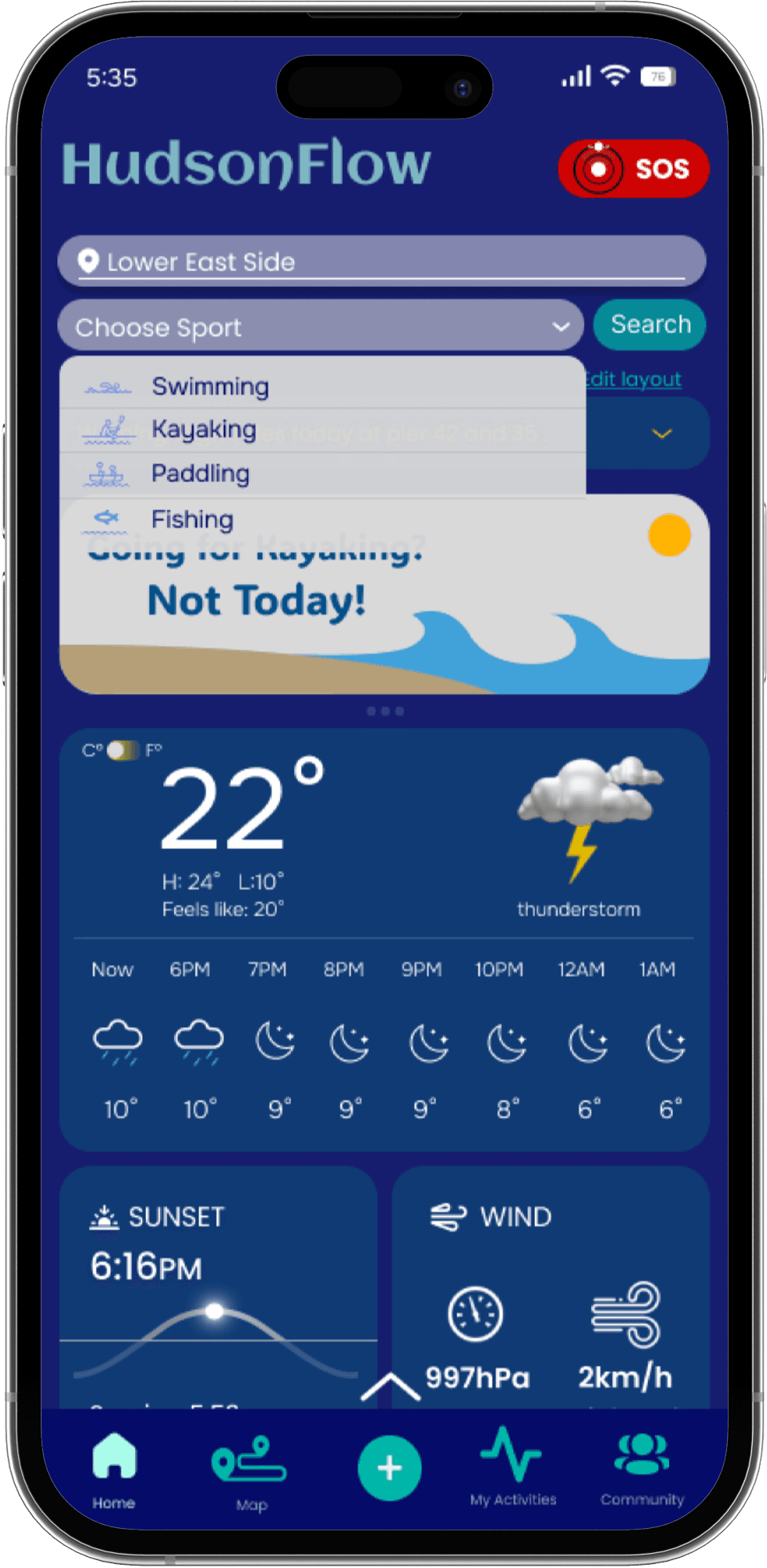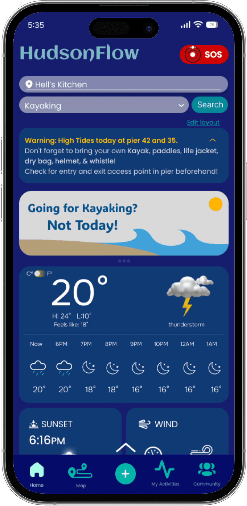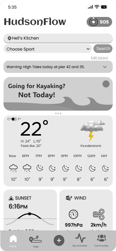 Adding weather data, tide warnings, and SOS access provided critical context, helping users evaluate risk more holistically before deciding to go kayaking.