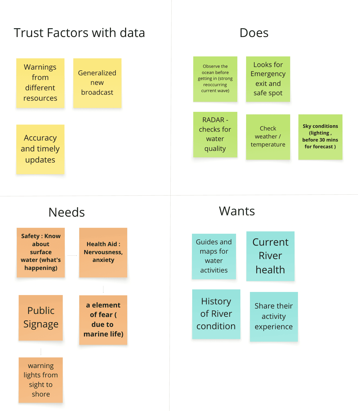 Based on patterns identified through user interviews and affinity mapping, we found that although data was available, users lacked clarity, trust, and real-time context. Without localized, visual, and actionable information, users either avoided the river altogether or relied on guesswork instead of data-driven decisions.