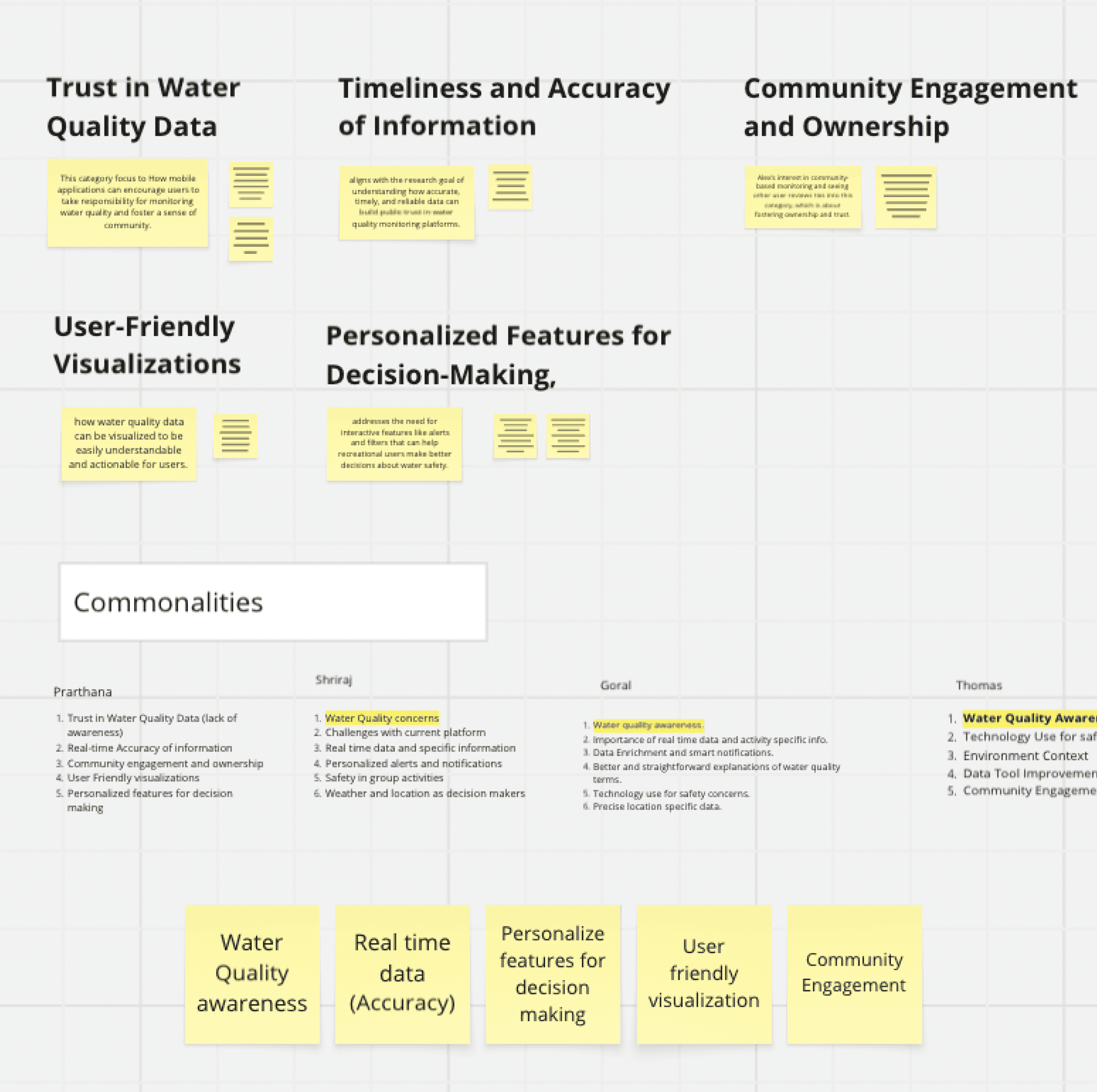 We conducted 5 in-depth interviews with recreational water users and local residents to understand how they currently assess water safety, what information they rely on, and why existing tools fail to support confident decision-making. Insights were synthesized through affinity mapping to identify recurring patterns and gaps.