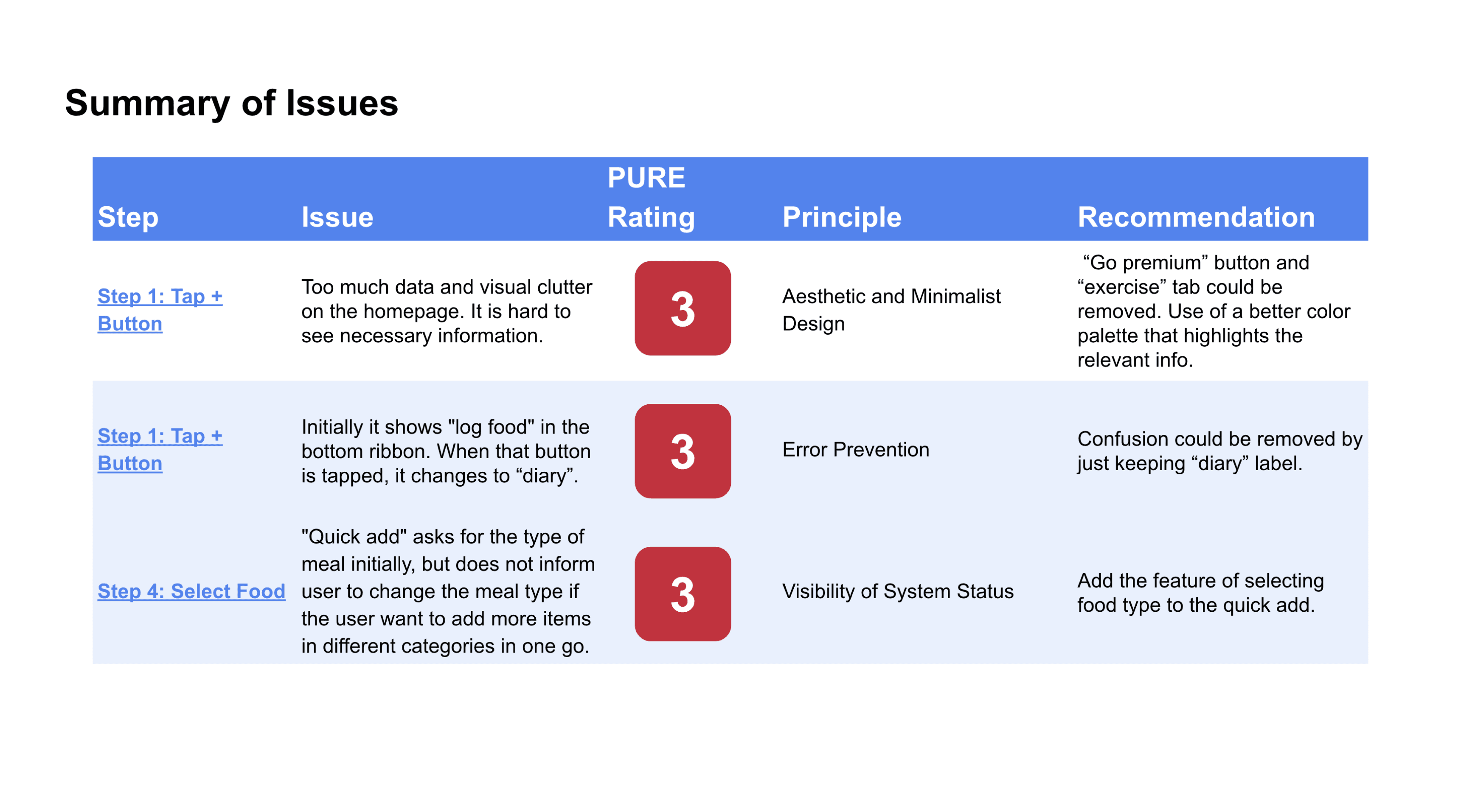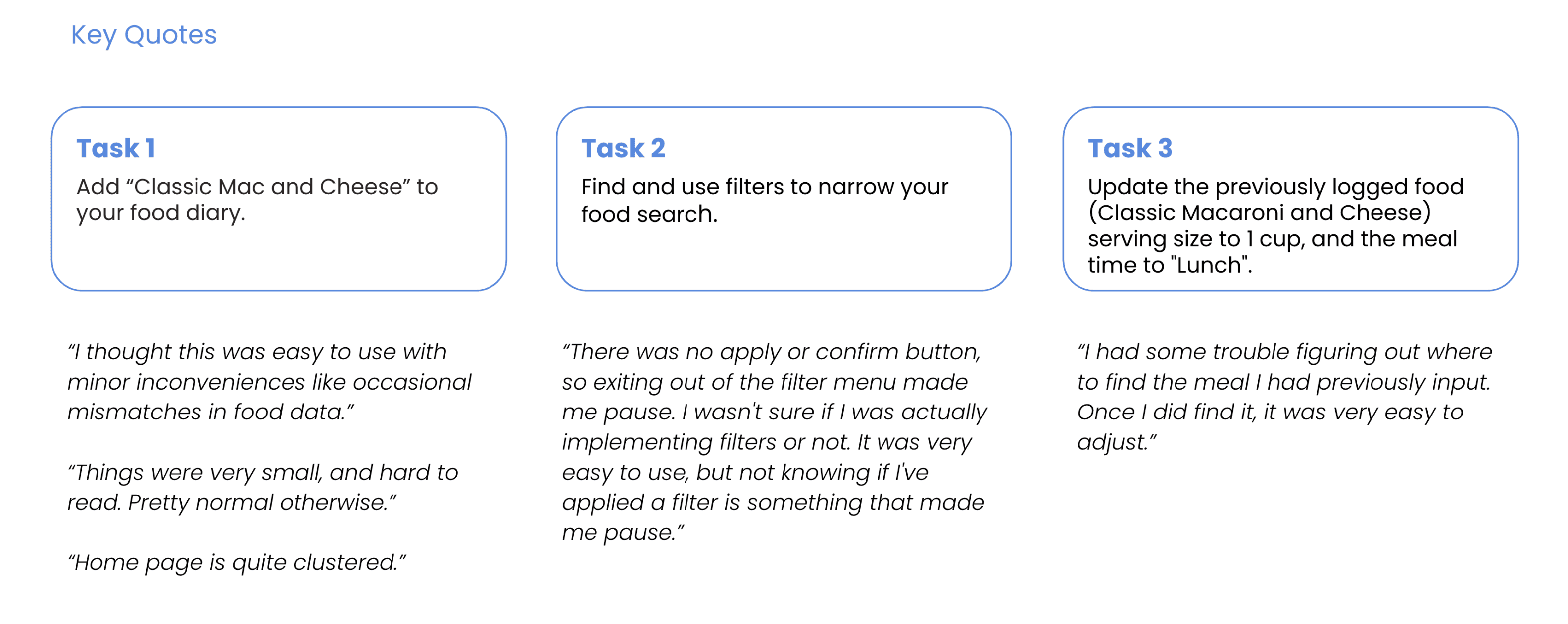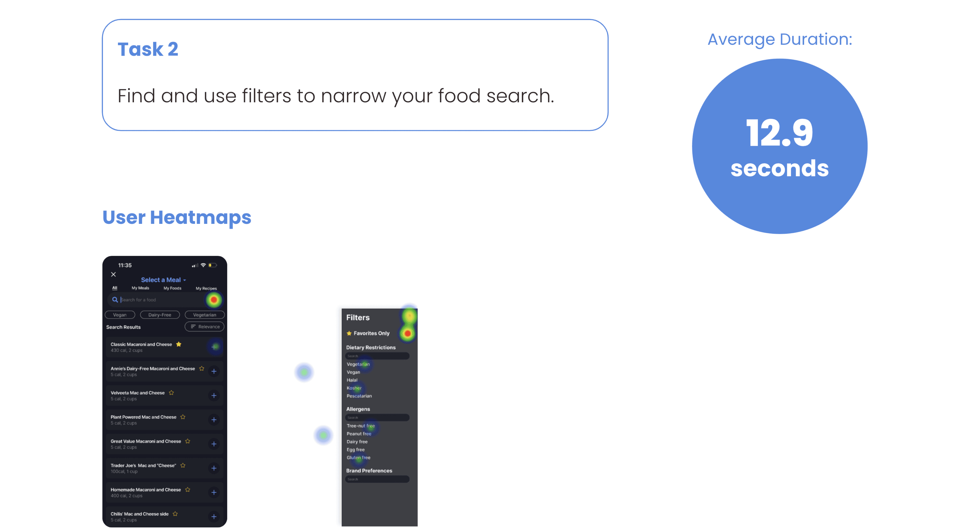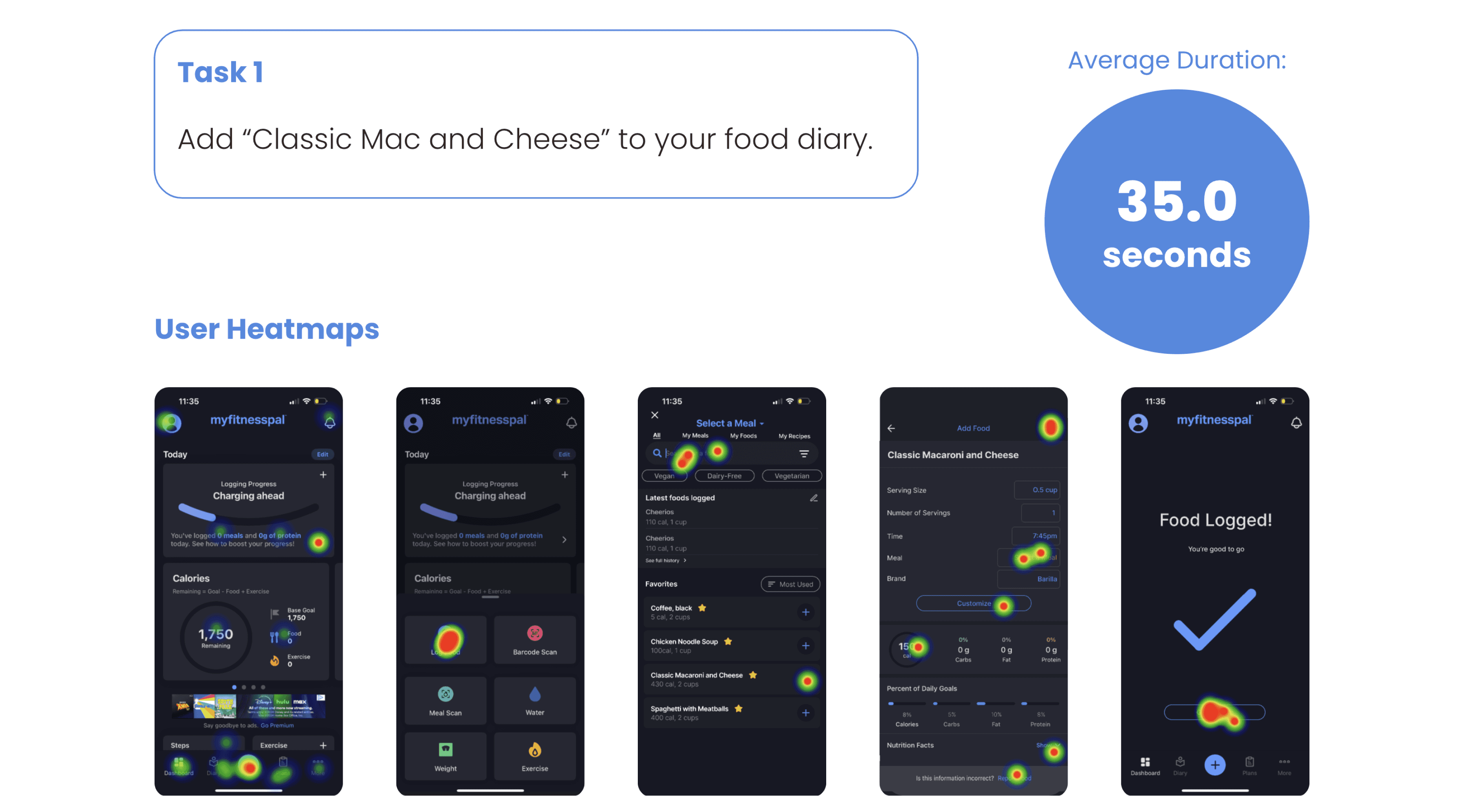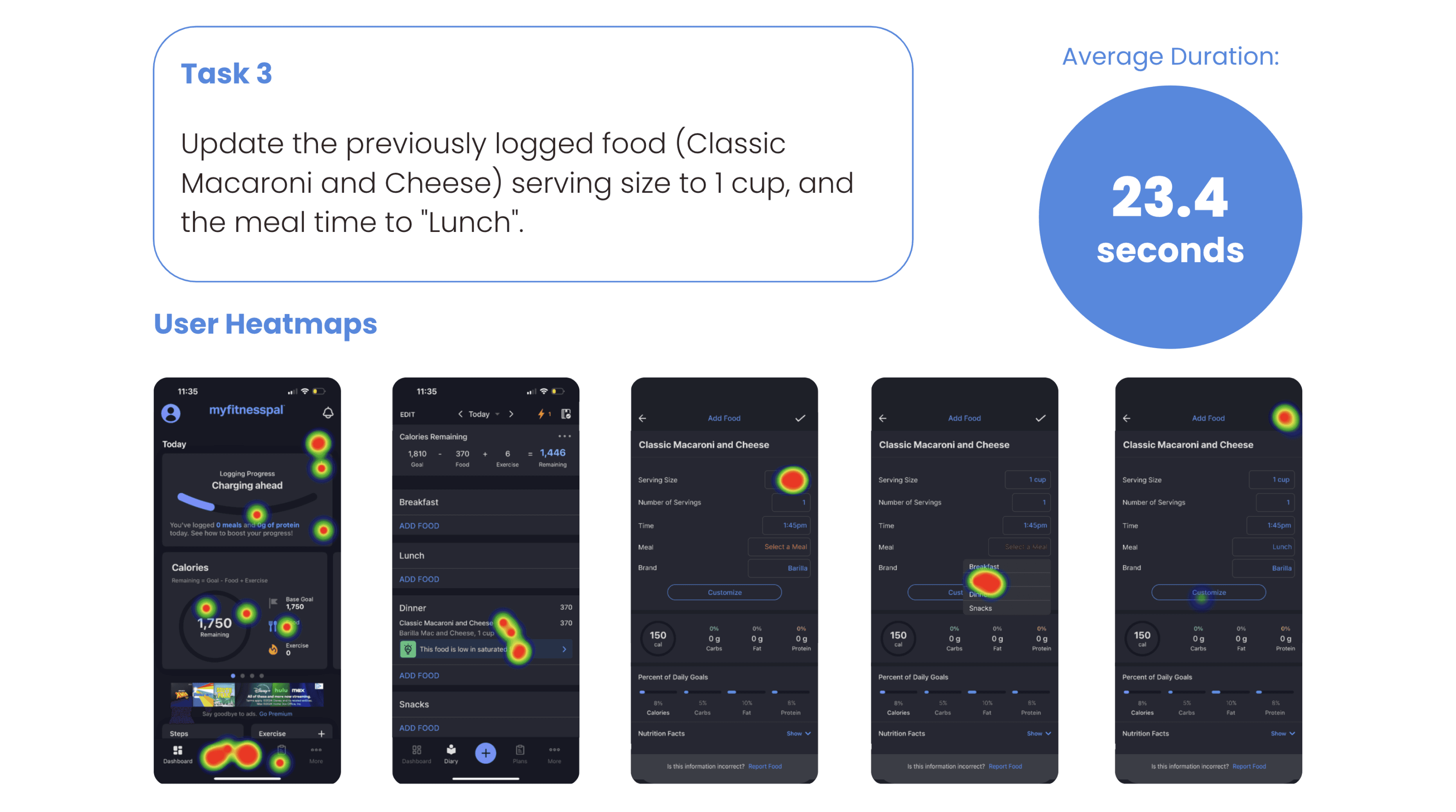 Users did not know how to access the food that they logged previously. Heatmaps showed that users tried multiple “edit” buttons on the landing page of the app before navigating to the “Diary” tab.